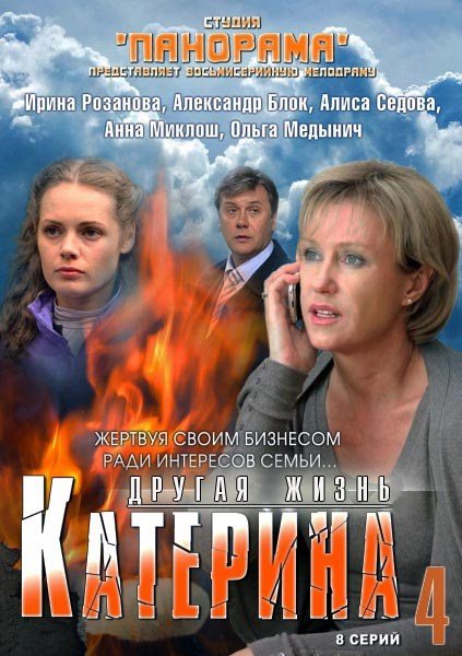 Название: Катерина-4Год: 2012 Жанр: мелодрама Режиссер: Андрей Щербинин В ролях: Ирина Розанова, Александр Блок, Алиса Седова, Сергей Маркеев, Сергей Лосев, Мария Валешная, Ирина Цветкова, Александр Кудренко, Светлана Смирнова (V), Сергей Уманов, Геннадий Смирнов, Виталий Салтыков